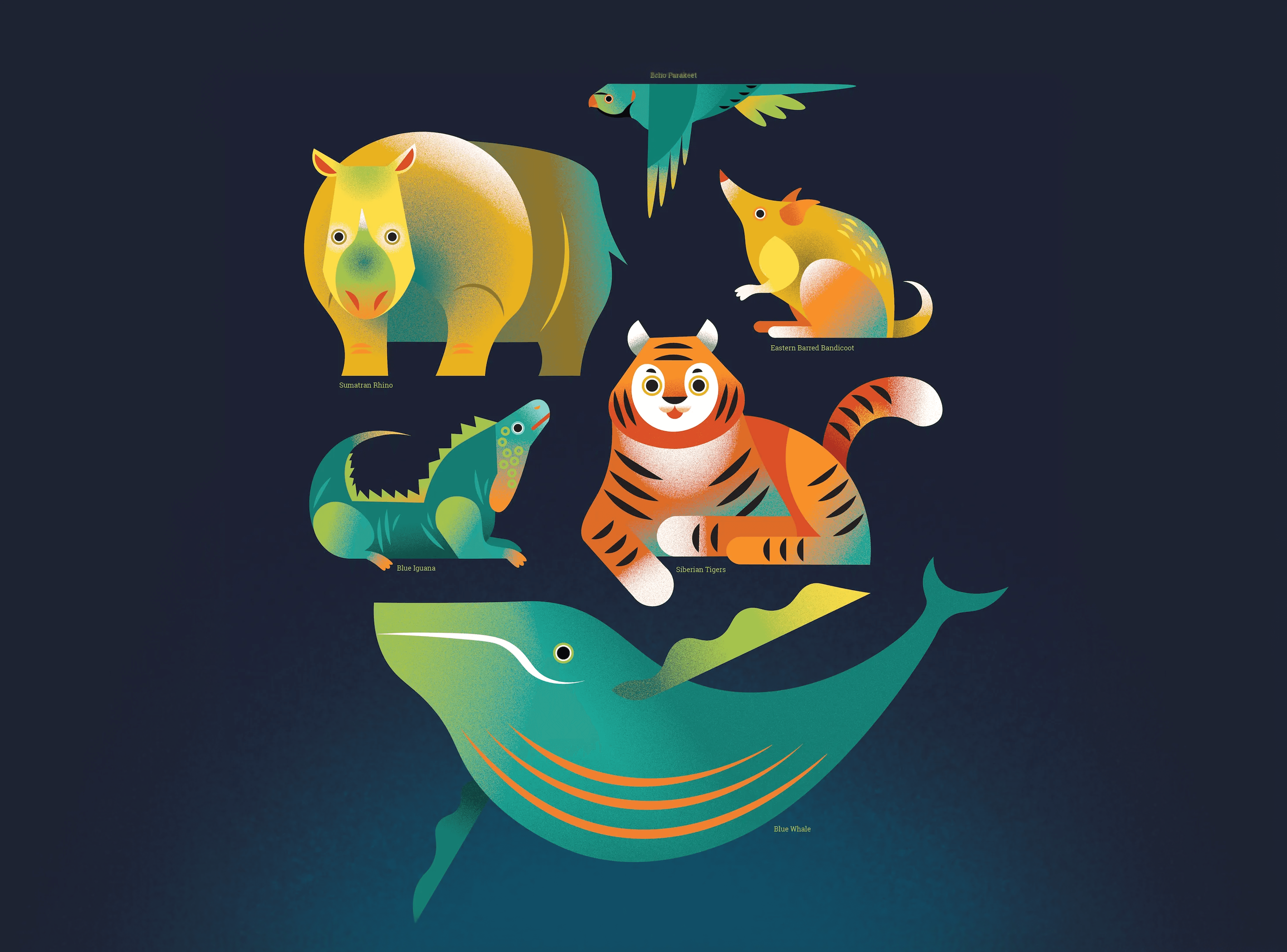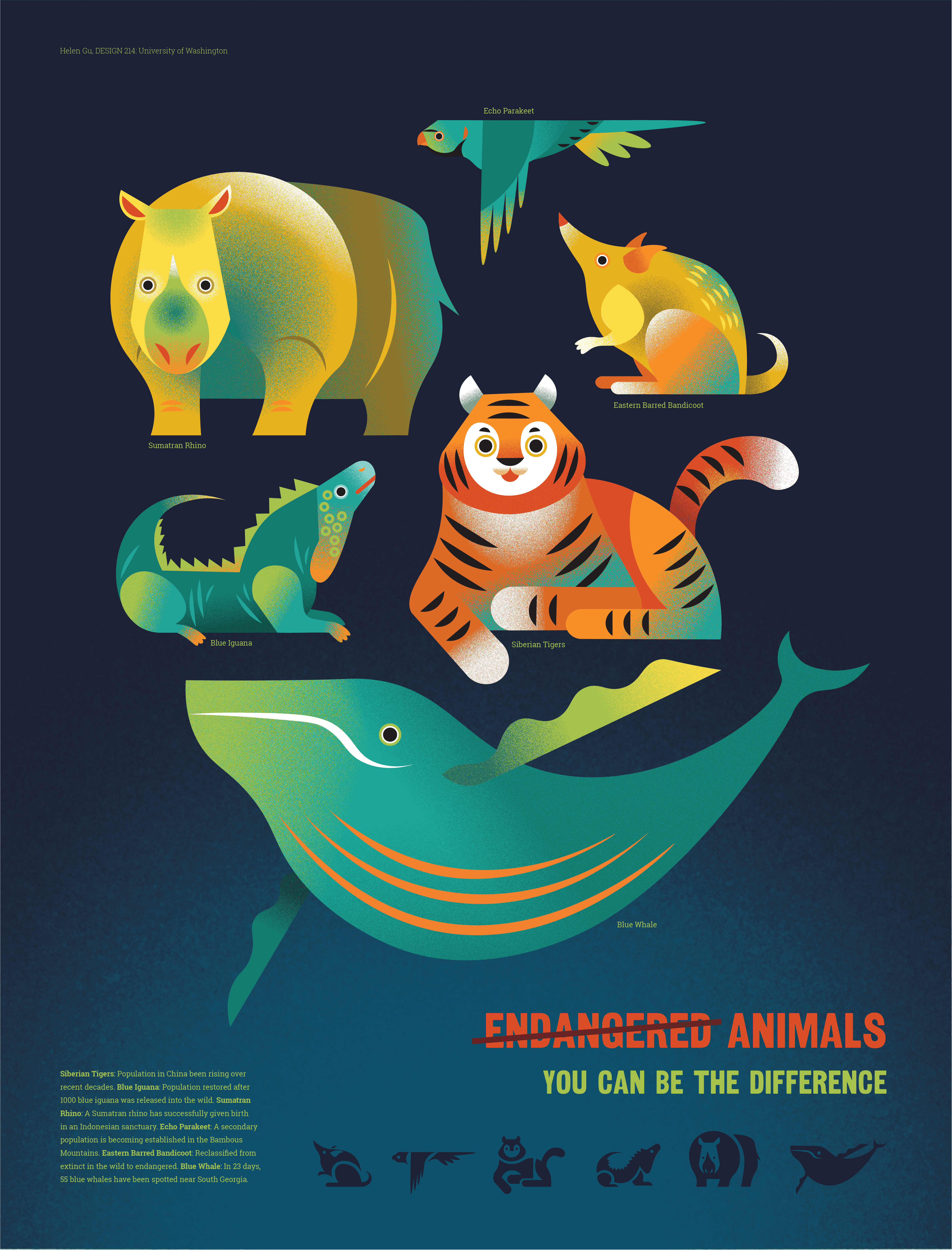 In this project, I highlight six unique animals: the Siberian Tiger, Blue Iguana, Sumatran Rhino, Echo Parakeet, Eastern Barred Bandicoot, and Blue Whale, emphasizing species with potential for population restoration over those already extinct.