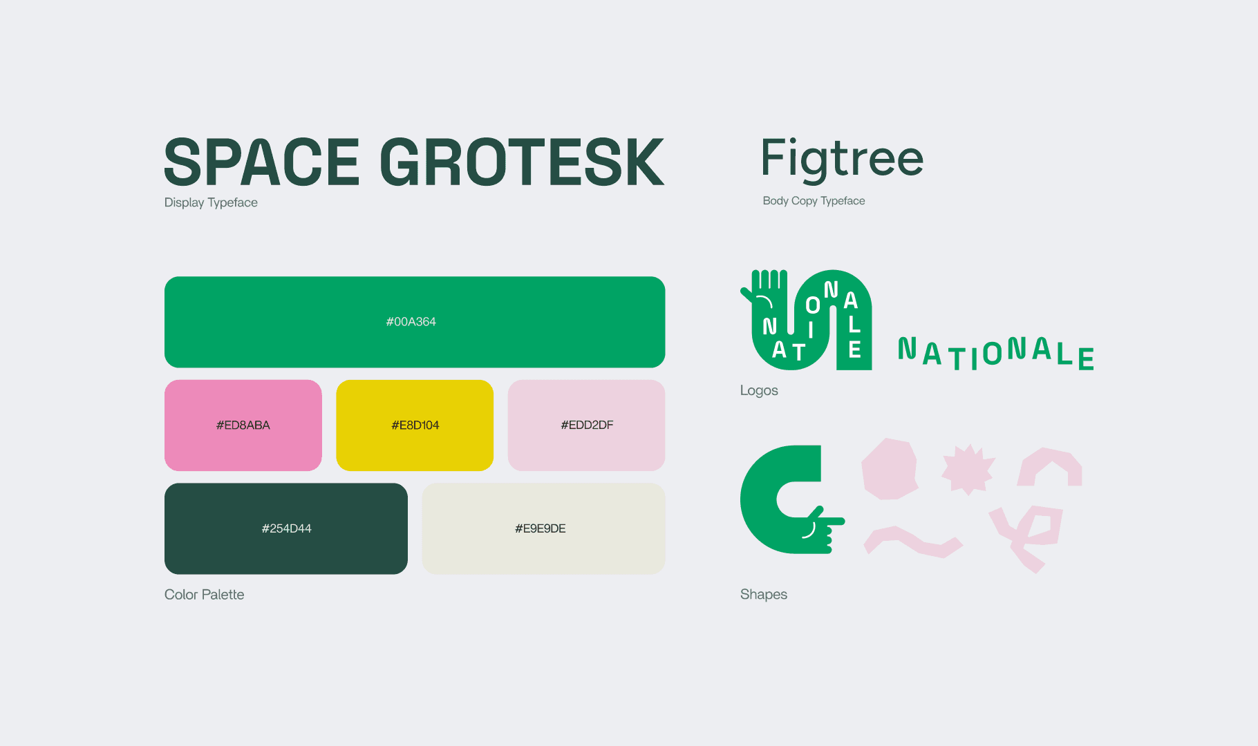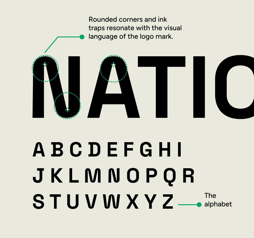 Nationale's brand identity relies on two main typefaces, Space Grotesk and Figtree. For the display typeface, I customized Space Grotesk to align with the overall visual language of the brand, incorporating rounded corners and ink traps that echo the curvy lines of the 'hand' logo.